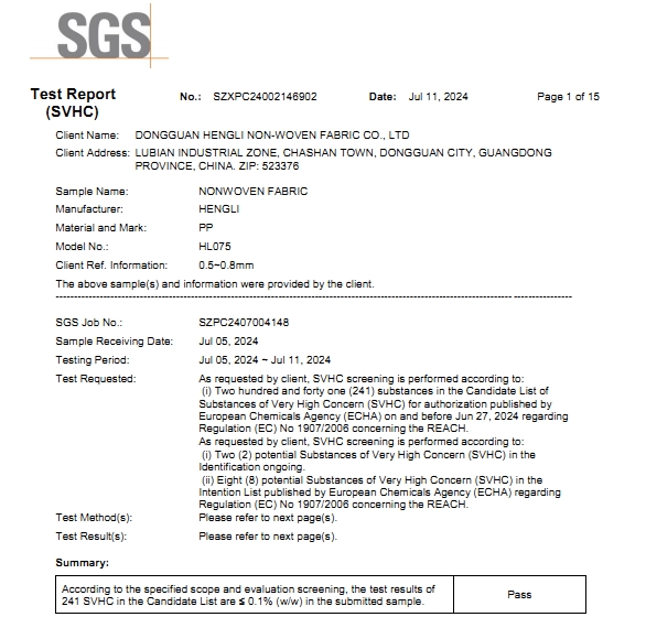 - 無紡布2024年SGS環保測試報告 注:測試結論依賴于對高關注物質如硼、鉻、砷等元素含量的檢測。 ...