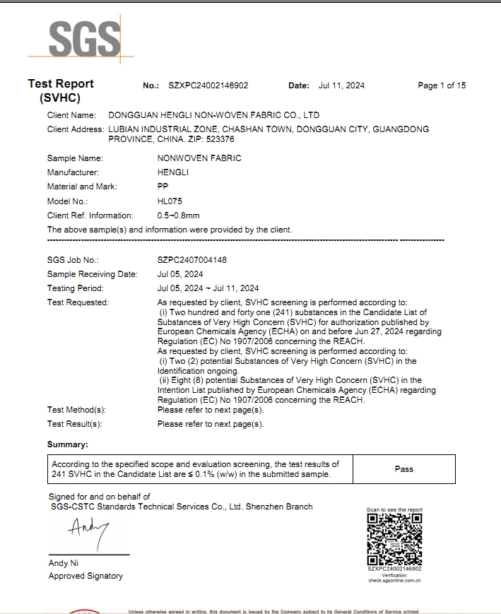 2024年SGS無紡布環(huán)保測試報(bào)告