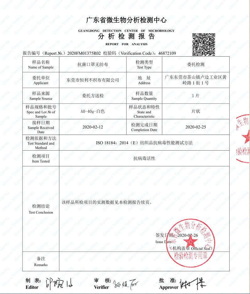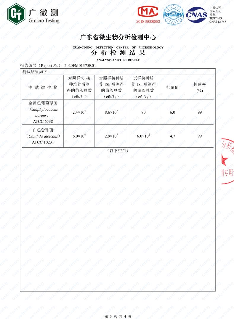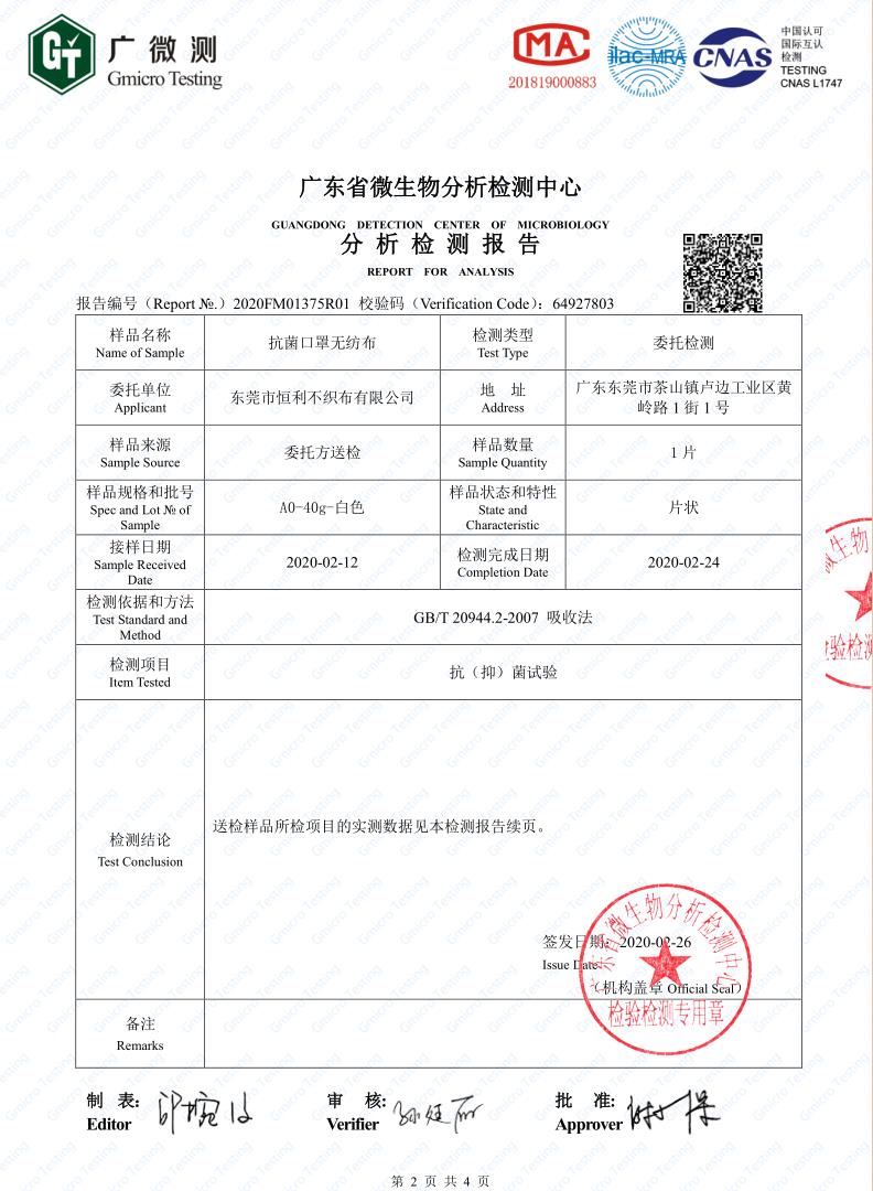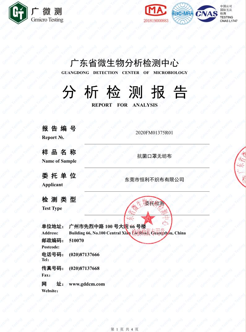本公司最新產(chǎn)品,抗菌口罩無紡布,可以用于一次性口罩的外層無紡布,所抗菌種為: